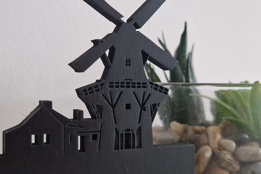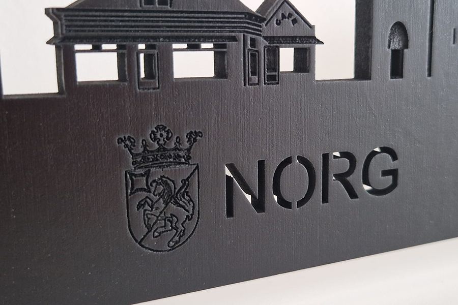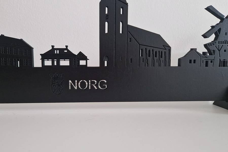 Skyline Norg is gemaakt van hout. De skyline bestaat onder andere uit de iconen: Korenmolen “de Hoop”, Pelinckshuis, (Brink 14), Café Zwaneveld, de Sint-Margarethakerk en Korenmolen Noordenveld. In deze skyline is ook het voormalige gemeentewapen van Norg verwerkt — een mooi stukje lokale geschiedenis. De skyline kan als eyecatcher een mooi plekje krijgen, omdat hij wordt geleverd met steuntjes. Wil je een andere skyline? Neem dan contact met ons op. De skyline is een eigen ontwerp, dus ons eigendom en mag niet worden gekopieerd.